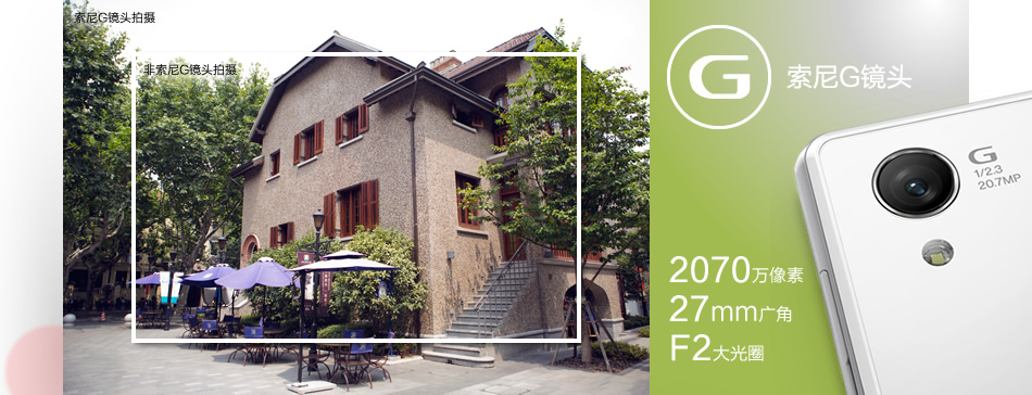 2070万个细腻的感动全新索尼 Xperia? Z1 L39h 影像智能手机,集索尼影像科技于一身,高水准成像媲美数码相机。约2070万像素摄像头,搭载1/2.3英寸大型 Exmor RS? 积层型影像传感器,敏锐感光,造就净澈影像;索尼G镜头,以27mm广角配合F2大光圈,为视野提供广阔空间,影像呈现更丰富完整。